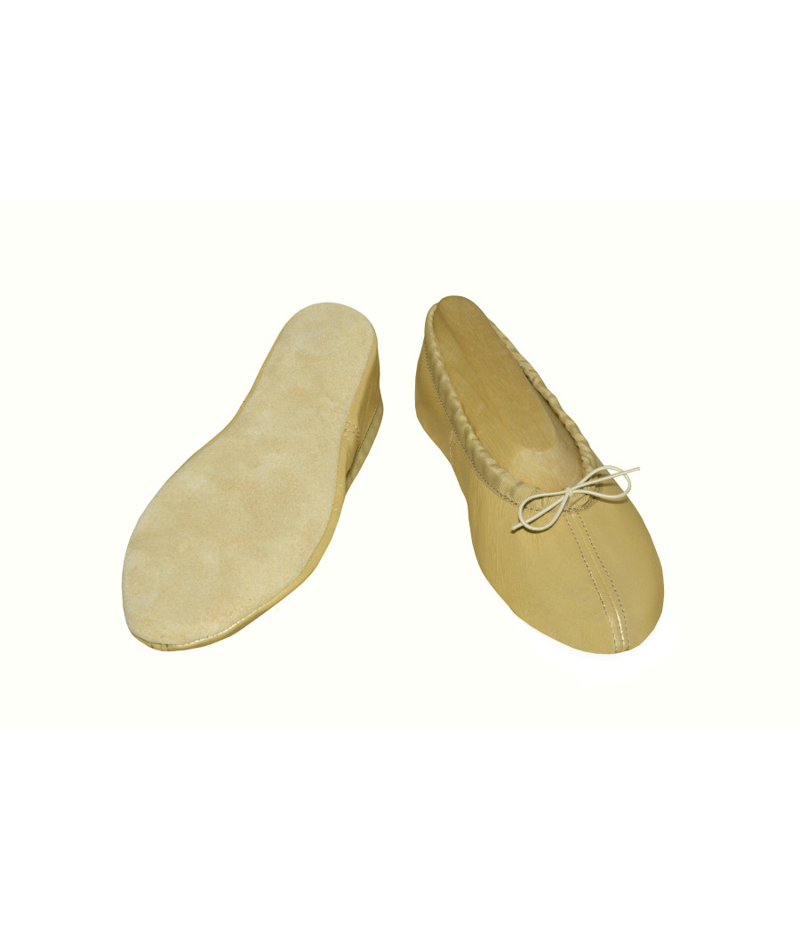Cvičky v provedení z kůže se dokonale přizpůsobí tvaru vašich nohou. Po obvodu je gumička na stažení vedená tunýlkem. Celokožená měkká podešev umožňuje plynulé otáčení a chodidla více vnímají strukturu povrchu, po kterém se pohybují.