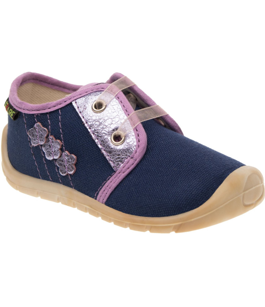 Dětská štróblovaná obuv, šněrovací. Našívací (štróblovaná) stélka umožňuje lepší ohyb boty. Vrchový materiál: textil. Podšívka: bez podšívky. Podešev je vyrobena z termokaučuku, který je velmi flexibilní příčně, ale i podélně.
